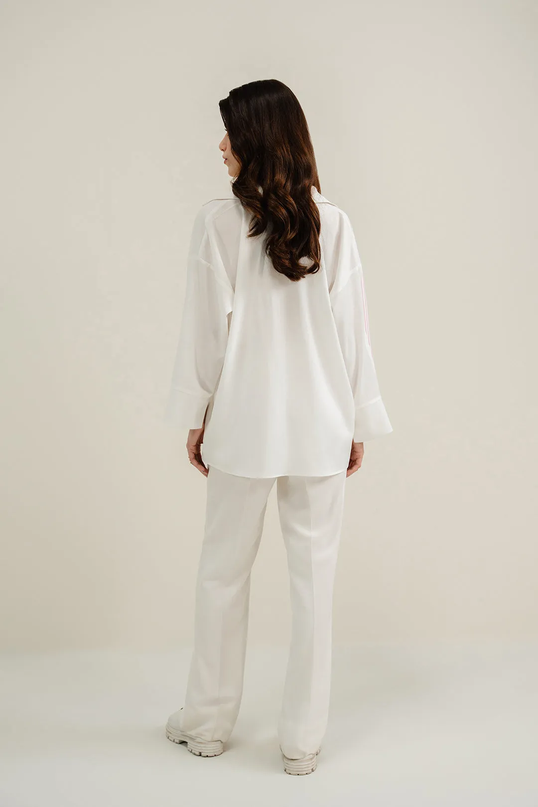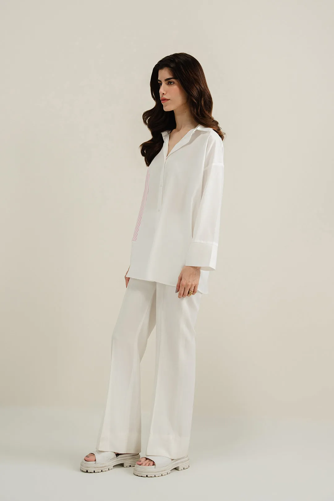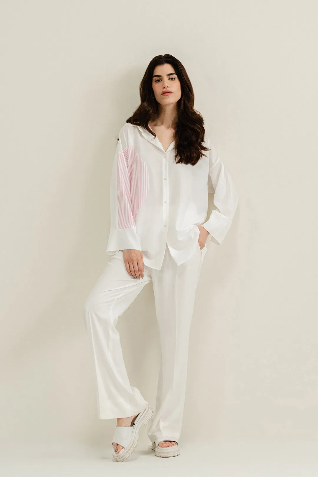 White striped button down made in soft crepe fabric.